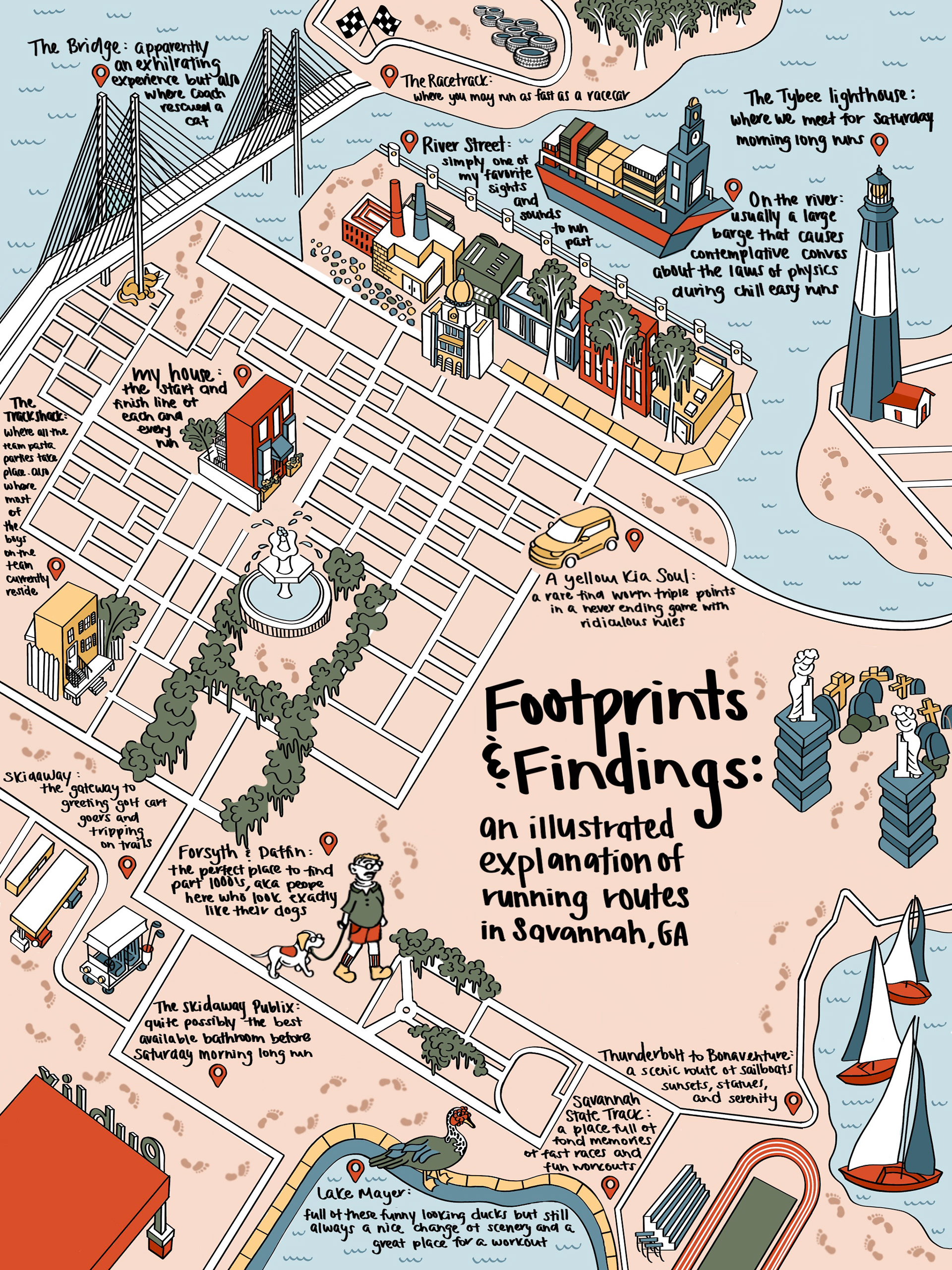 illustrated map of Savannah, GA, inspired by my personal perspective of the city through running routes
